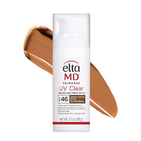 Designed and tested on deeper skin tones, EltaMD UV Clear Deep Tinted Broad Spectrum SPF 46 is a lightweight, oil-free sunscreen formulated with 5% Niacinamide (Vitamin B3) to help reduce the appearance of blemishes and discoloration on your skin. This broad-spectrum sunscreen contains micronized Zinc Oxide to protect your skin from damaging UVA (aging) and UVB (burning) rays.